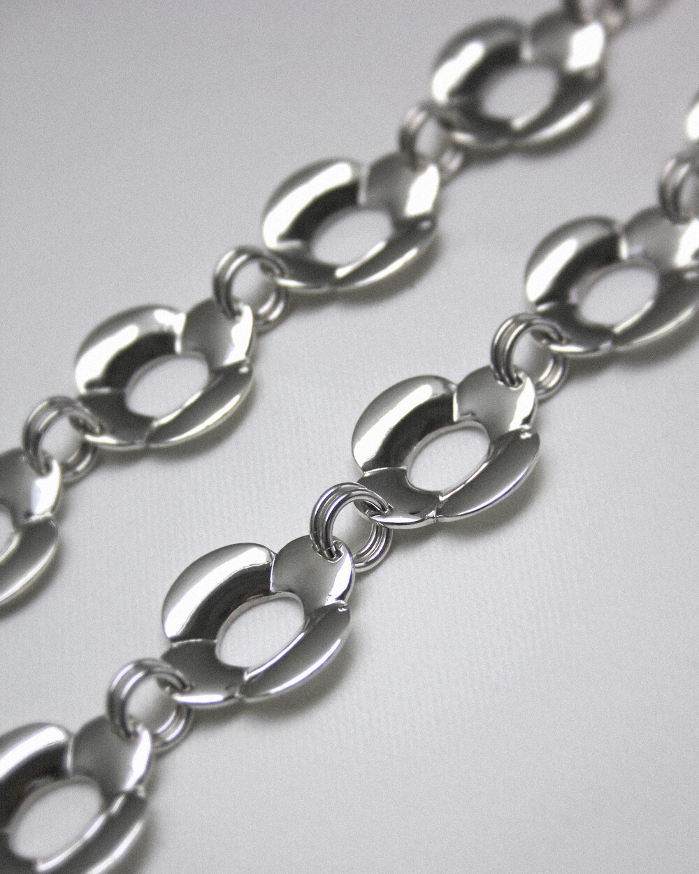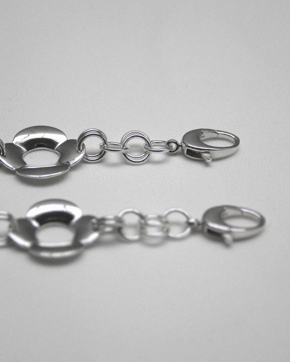 팬던트 사이의 연결 고리와 사이즈 조절 체인을 동일한 방식으로 제작하여 통일감이 느껴지며,
