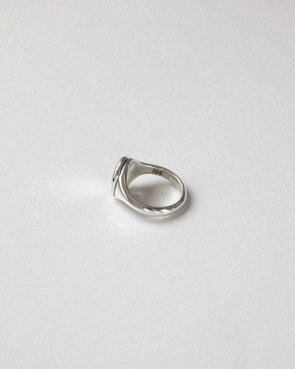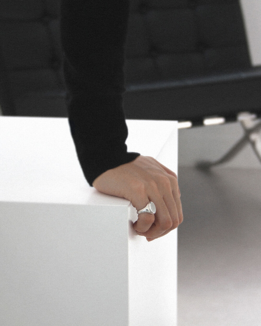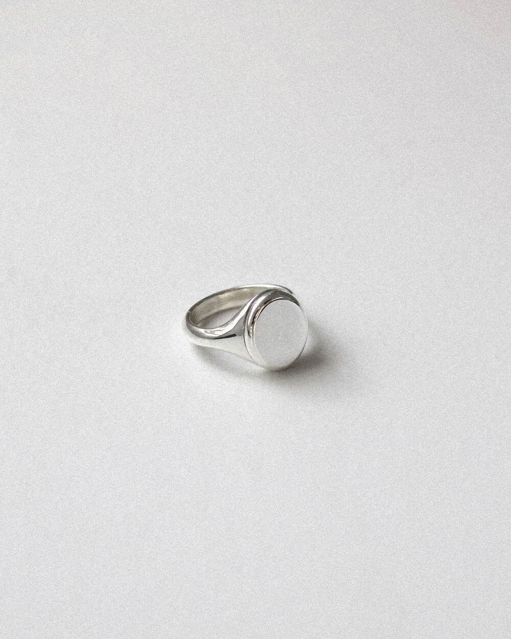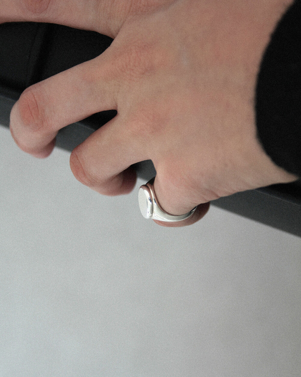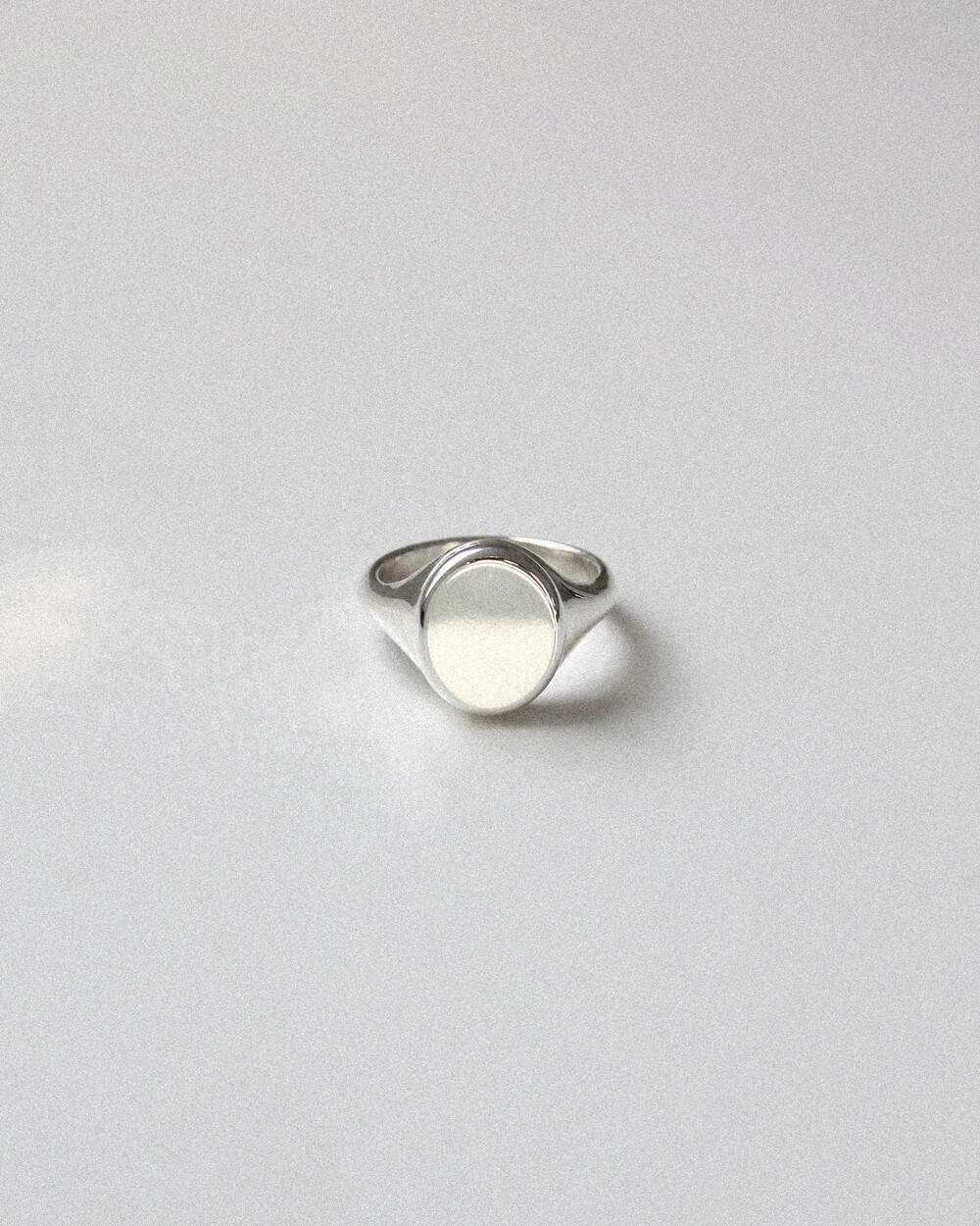 윗면이 도톰한 타원으로 장식된, 클래식한 디자인의 인장 반지(Signet Ring*)입니다.